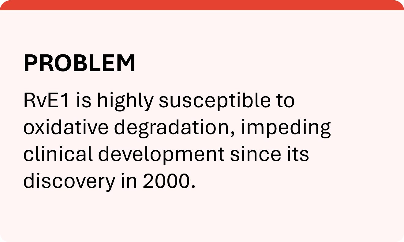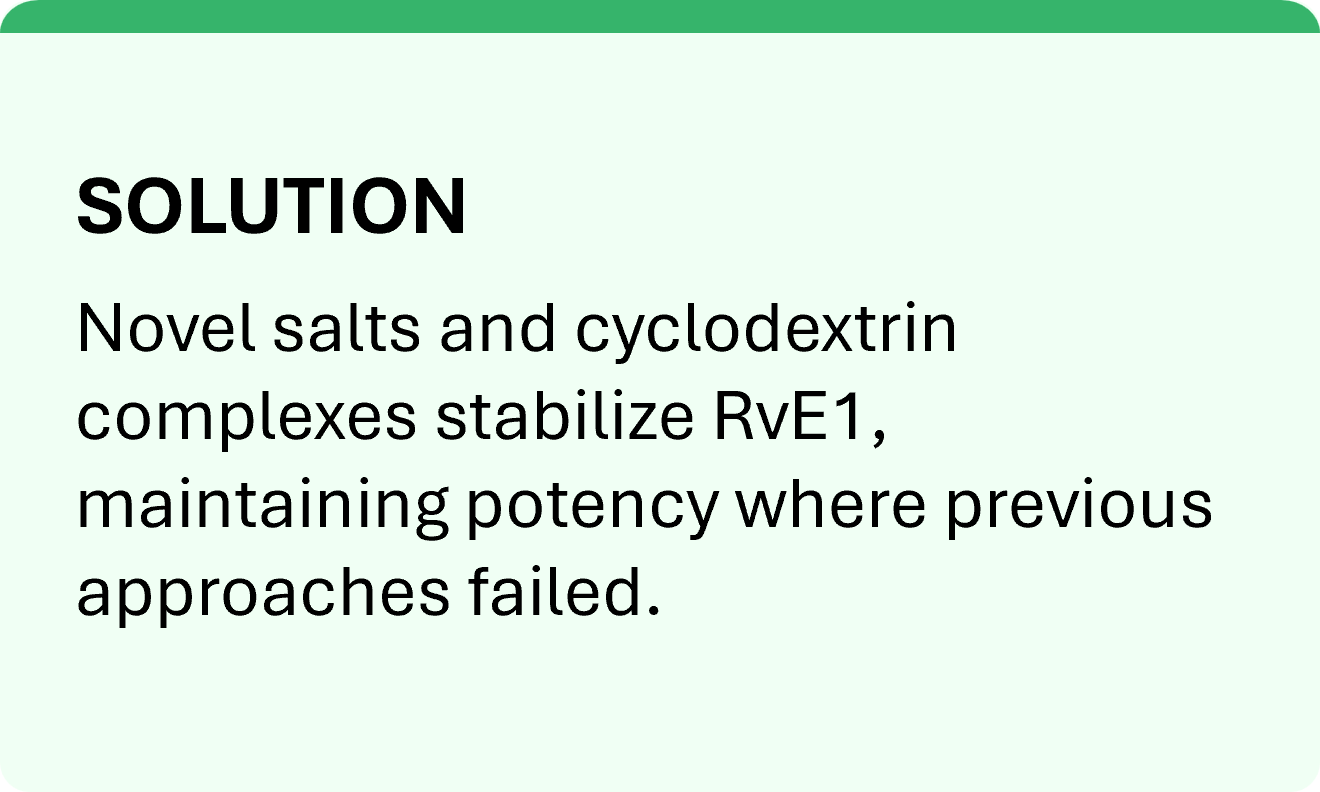 Novel pharmaceutical composition of RvE1 solves the problem blocking clinical development of resolvin drugs.
